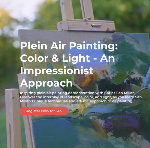 Inspiring plein air painting demonstration with Carlos San Millàn. Discover the interplay of landscape, color, and light, as you learn San Millán's unique techniques and artistic approach to oil painting.